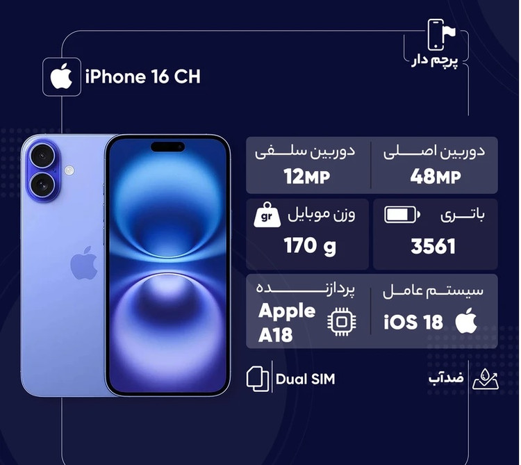 مشخصات باتری : شارژ با سیم به کمک تکنولوژی PD۲.۰ و ۵۰ درصد شارژ در ۳۰ دقیقه/ شارژ بیسیم با توان ۲۵ وات (از راه MagSafe)/ شارژ بیسیم با توان ۱۵ وات (از راه شارژرهای بیسیم سازگار با تکنولوژی Qi۲) / شارژ معکوس با توان ۴.۵ وات به صورت با سیم/